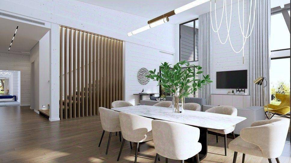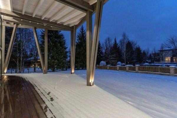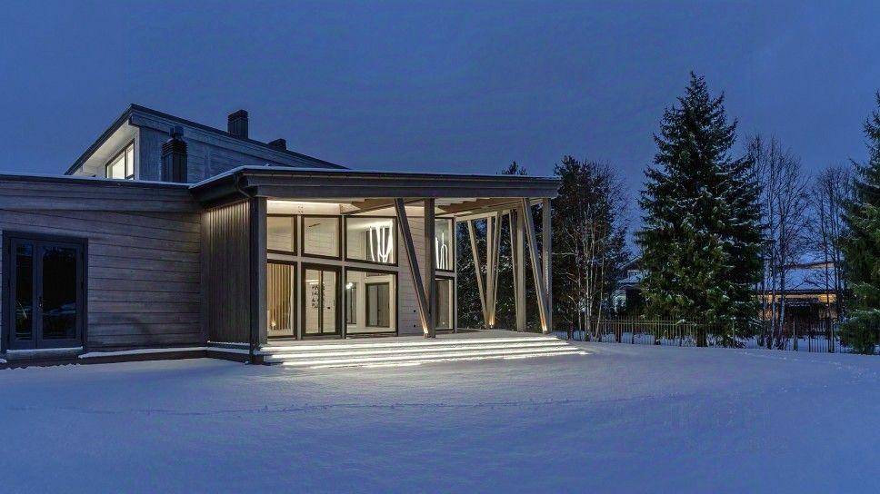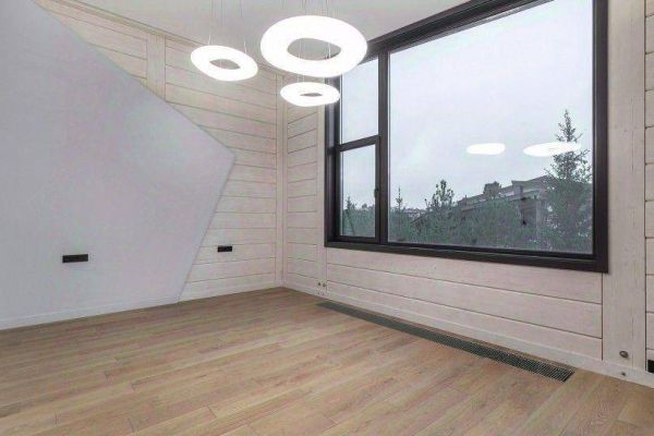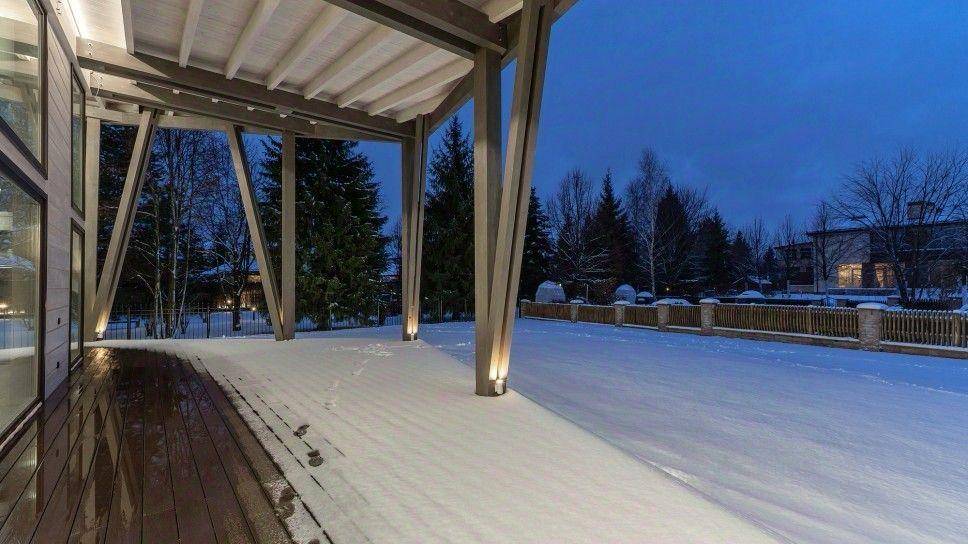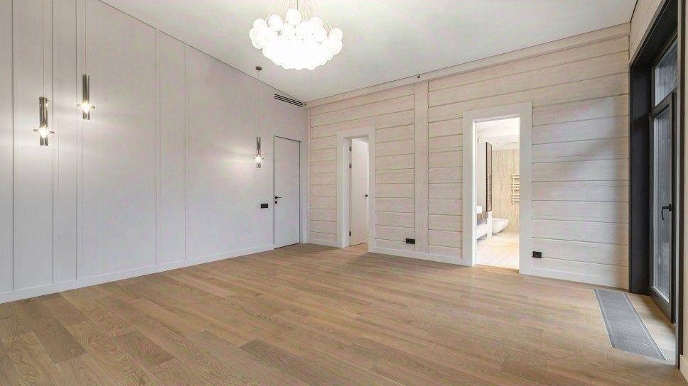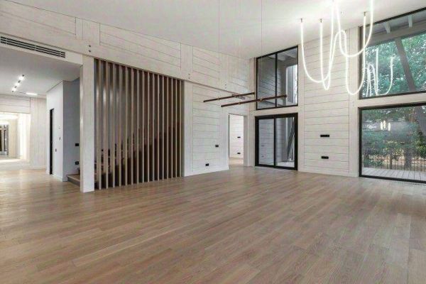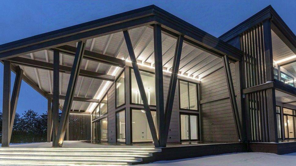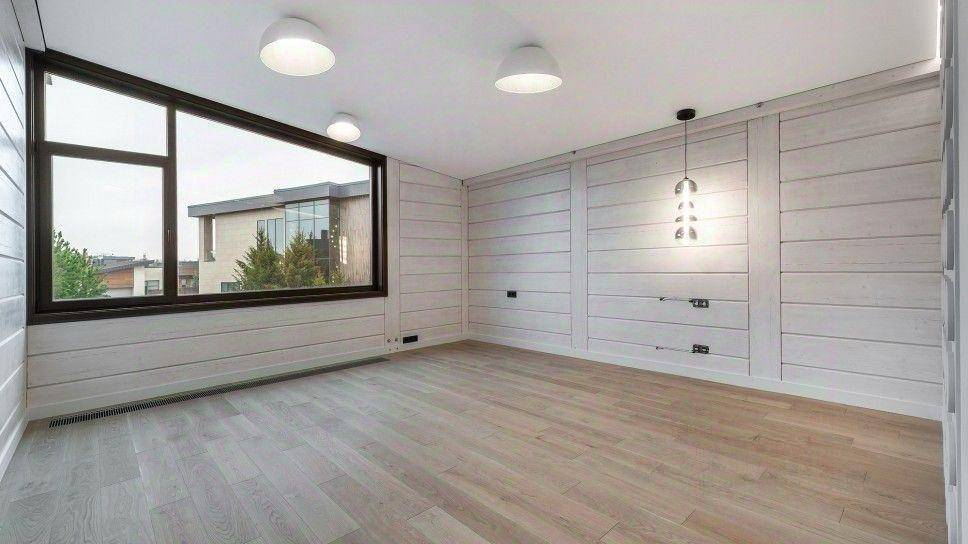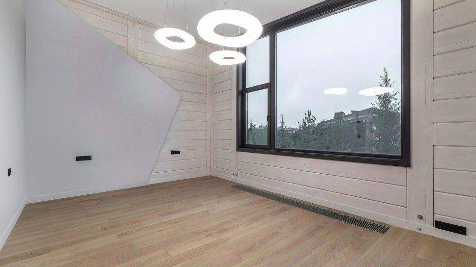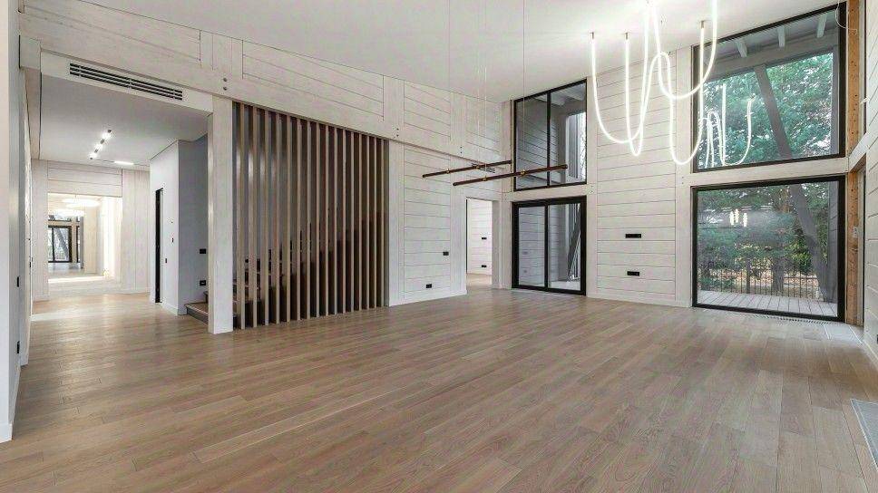 Дом из клеёного бруса 2-х уровневый, деревяный, площадью 500 кв.м. На первом этаже: прихожая, большая гардеробная, гостевой санузел, кухня-столовая-гостиная с выходом на террасу 90м2, постирочная, кабинет, гостевая спальня с санузлом, котельная, кладовая для спортивного и садового инвентаря, навес для авто. На втором этаже: хозяйская спальня с гардеробной и санузлом, 2 детские спальни с санузлами и гардеробными, холл.