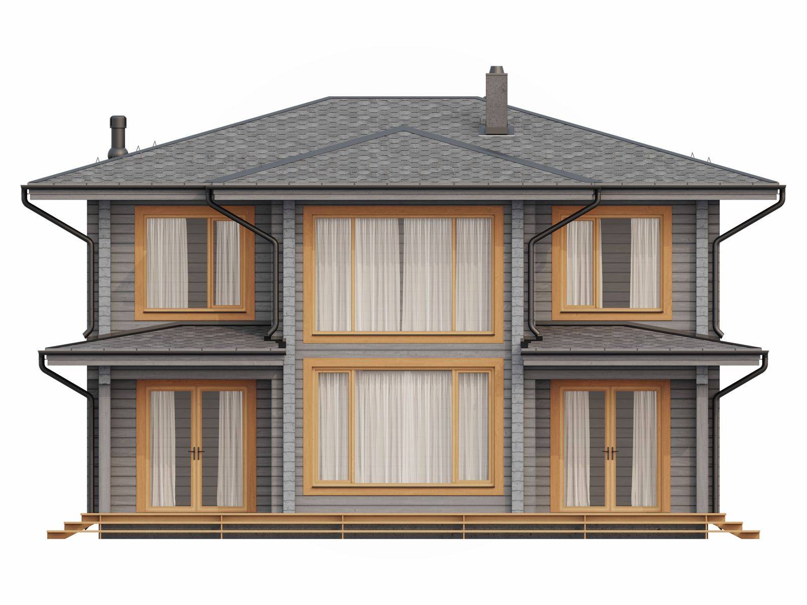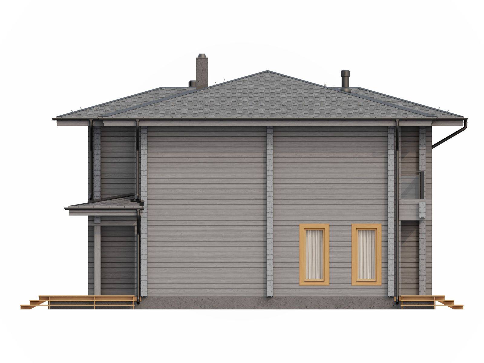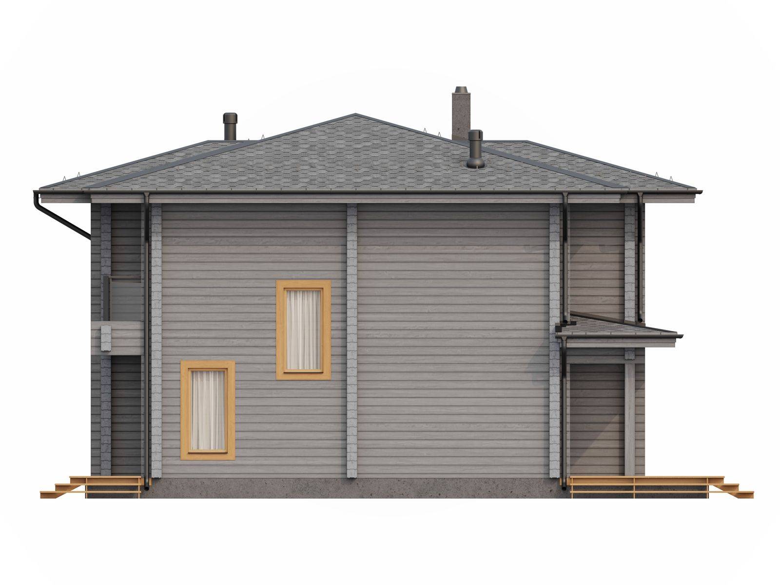 Лестница на второй этаж (если присутствует в проекте) исполняется техническая. Входная группа комплектуется ступенями. Дверные и оконные проемы выполняются с ройками. Двери и окна не входят в данную стоимость и заказываются отдельно по желанию заказчика. Наружная и внутренняя отделка не выполняется.