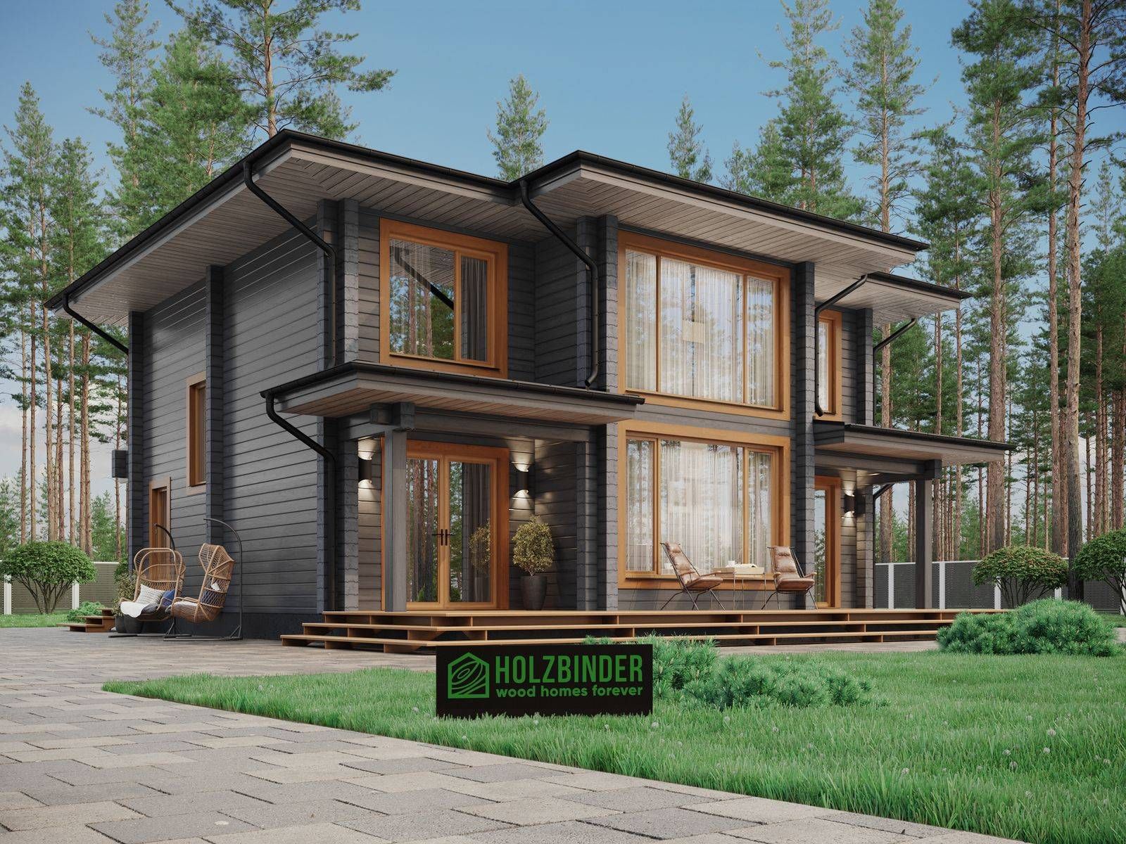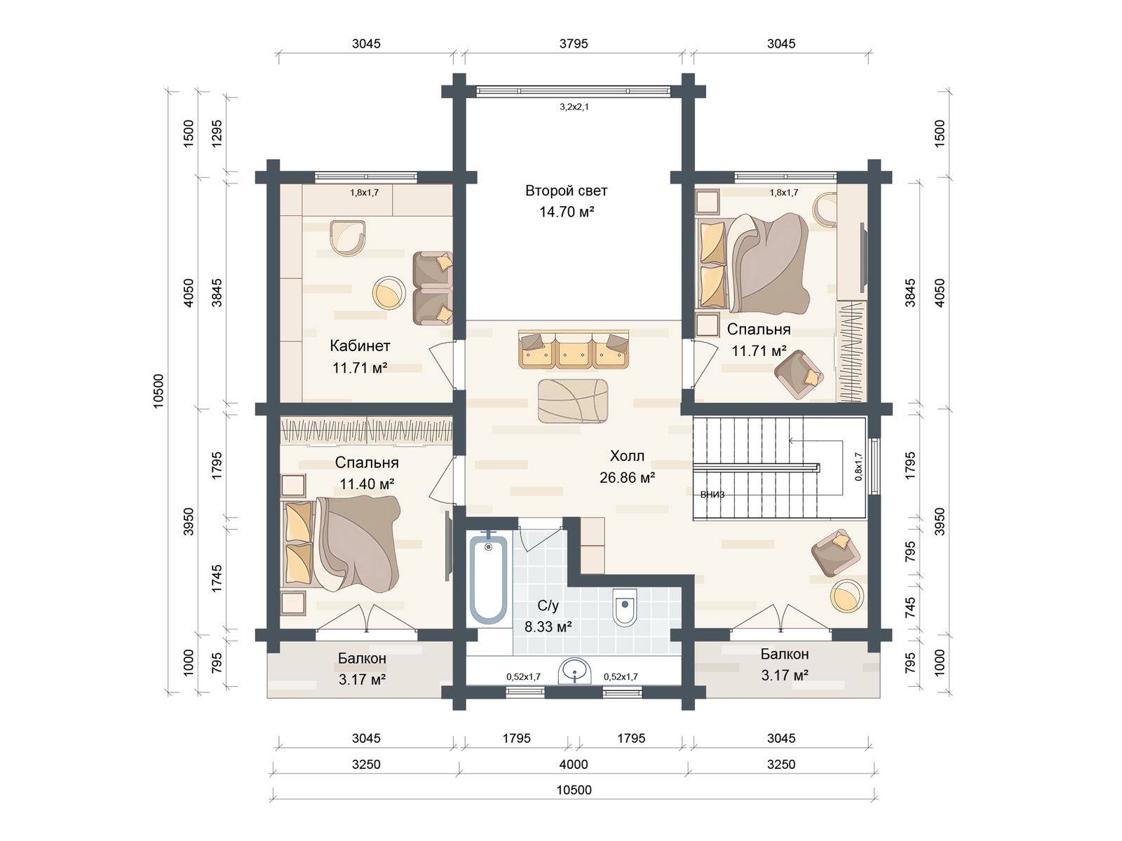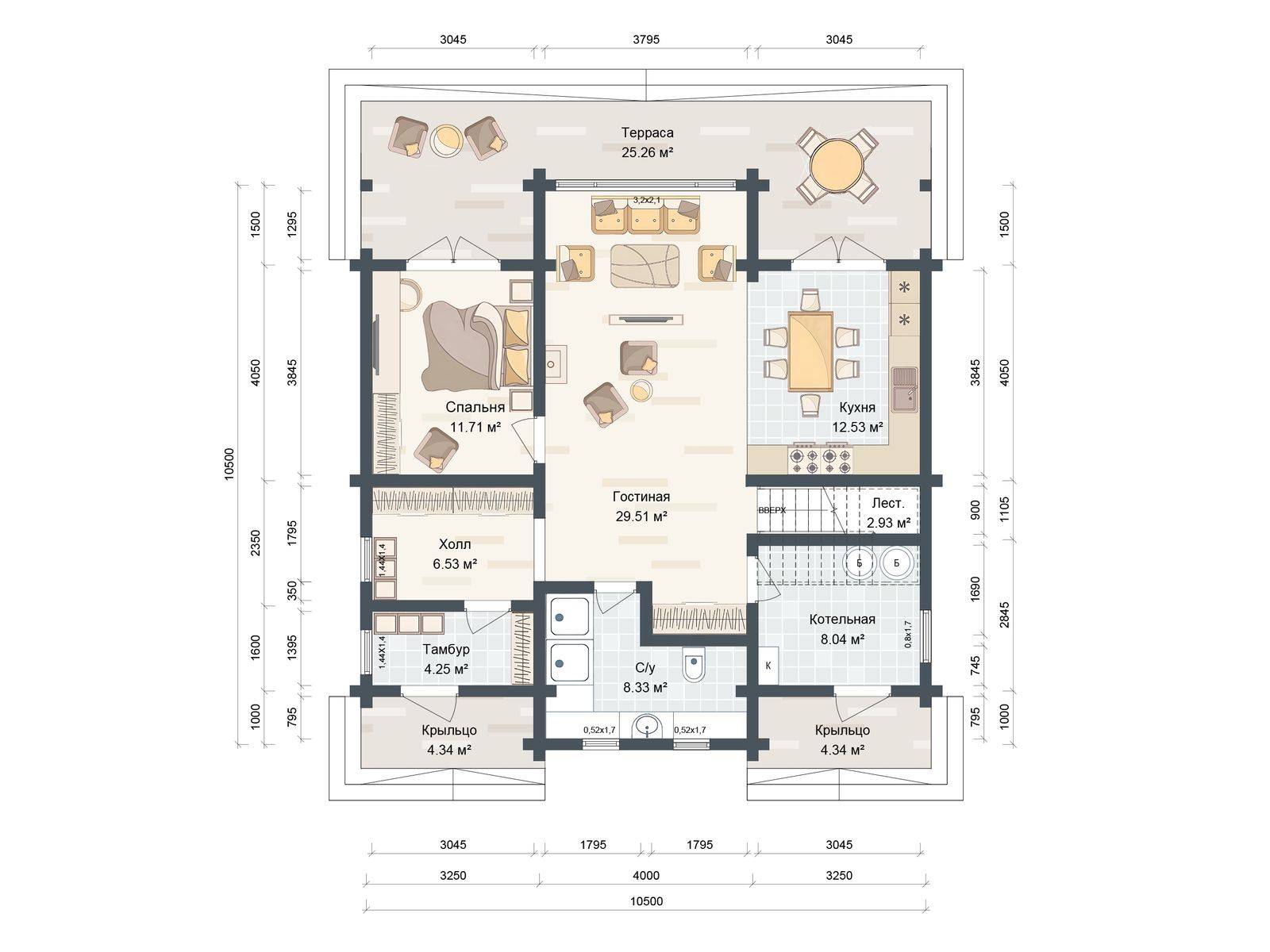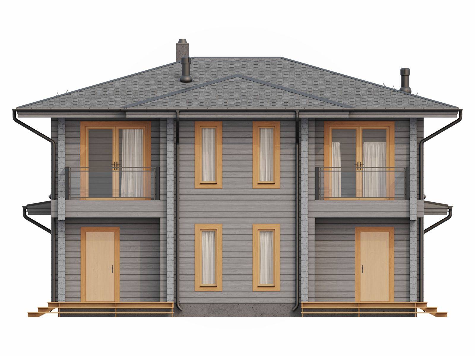 Лестница на второй этаж (если присутствует в проекте) исполняется техническая. Входная группа комплектуется ступенями. Дверные и оконные проемы выполняются с ройками. Двери и окна не входят в данную стоимость и заказываются отдельно по желанию заказчика. Наружная и внутренняя отделка не выполняется.