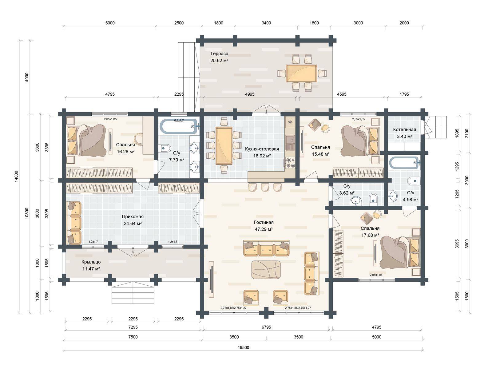 Нижний венец исполняется из бруса 150х150 мм, устанавливается по периметру, и одна перемычка посередине (при необходимости, в зависимости от размера и конфигурации дома, могут устанавливаться дополнительные перемычки). -