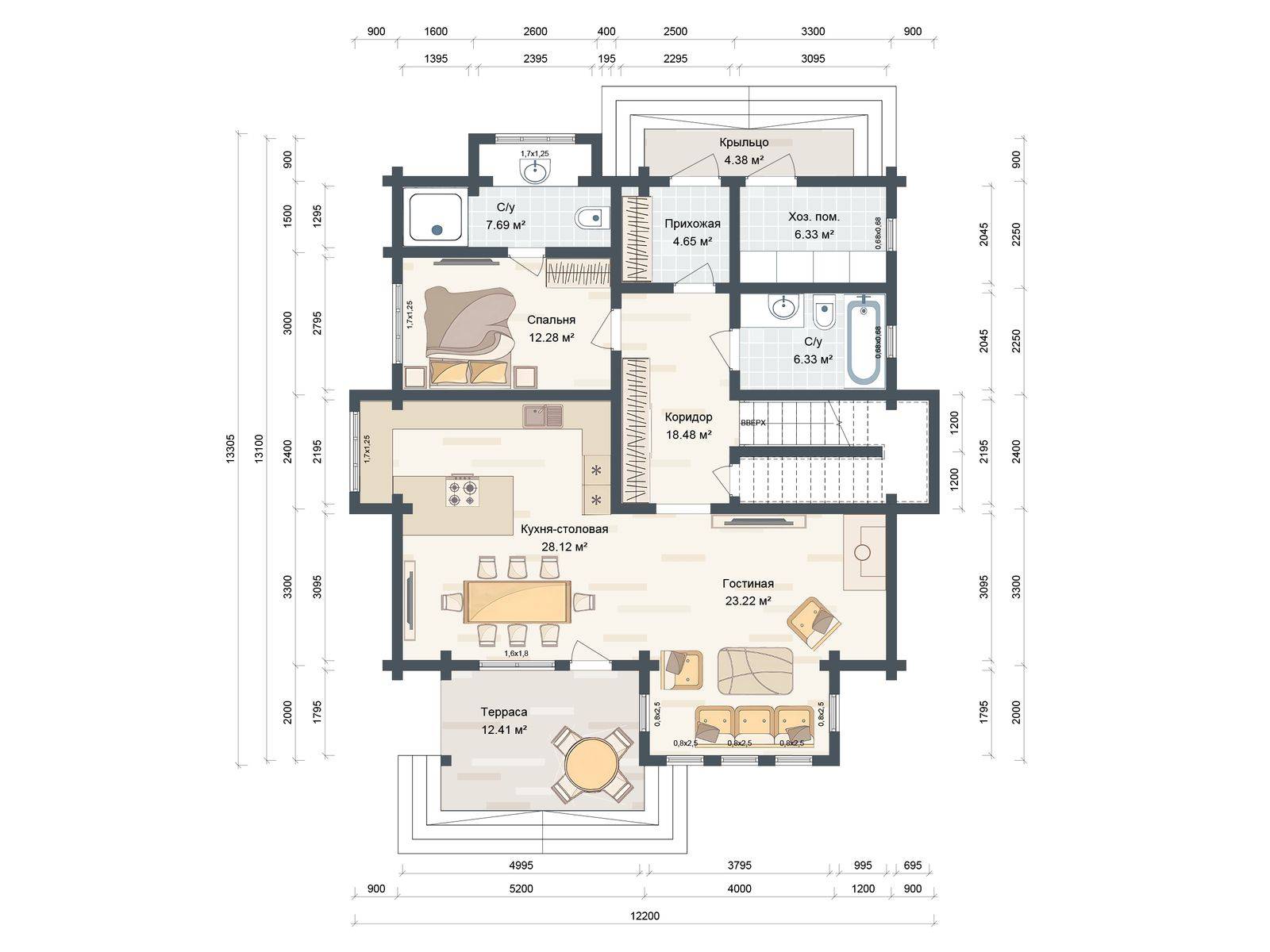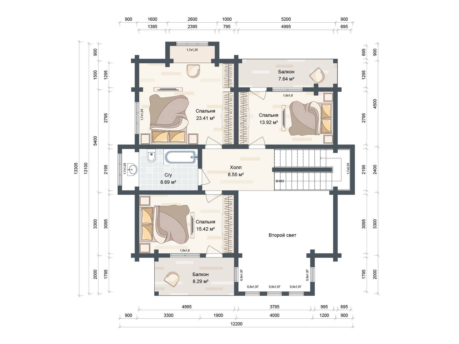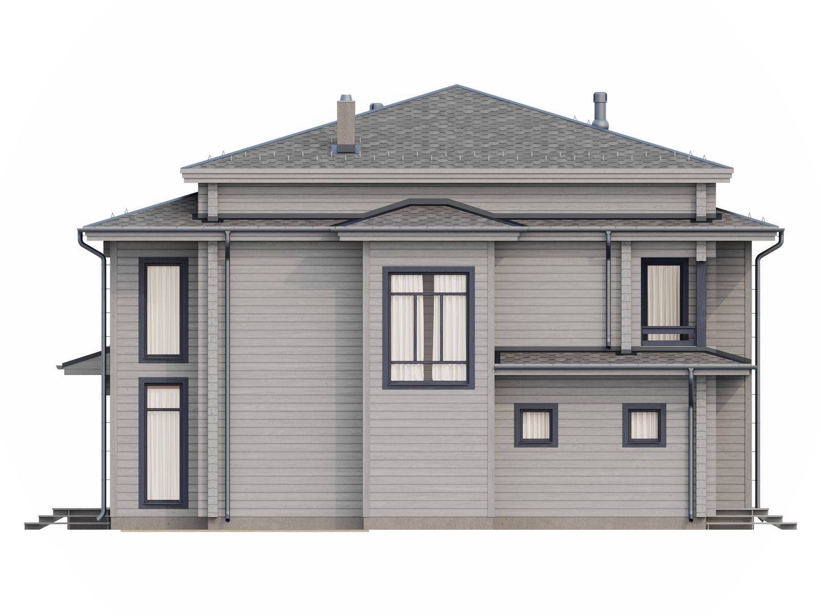Лестница на второй этаж (если присутствует в проекте) исполняется техническая. Входная группа комплектуется ступенями. Дверные и оконные проемы выполняются с ройками. Двери и окна не входят в данную стоимость и заказываются отдельно по желанию заказчика. Наружная и внутренняя отделка не выполняется.
