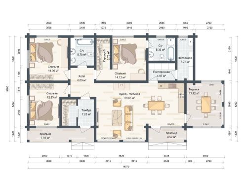 Поэтажные планы, фасады, разрезы, 3D виды. План фундамента. План развертки скатов кровли. План раскладки балок цокольного перекрытия. План раскладки балок межэтажного перекрытия. План стропил. Развертки стен.
