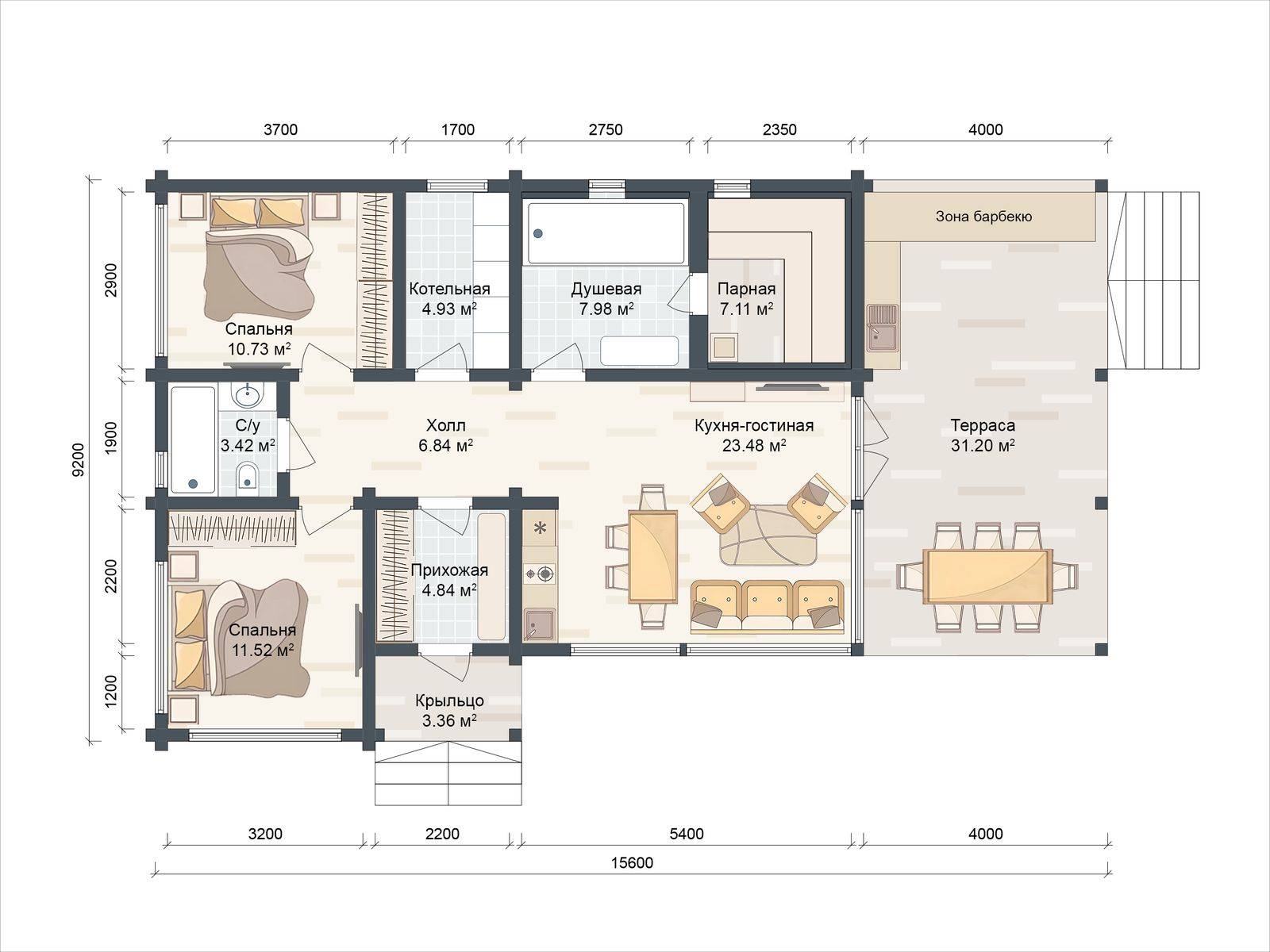 Нижний венец исполняется из бруса 150х150 мм, устанавливается по периметру, и одна перемычка посередине (при необходимости, в зависимости от размера и конфигурации дома, могут устанавливаться дополнительные перемычки). -