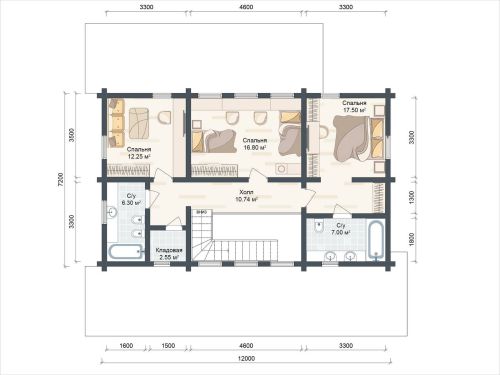 Стропила выполняются из бруска 40х150 мм и устанавливаются с шагом не более 60 см. Для перекрытия над вторым этажом используются лаги 40х150 мм и устанавливаются с шагом не более 60 см. Высота конька стропильной системы от пола второго этажа не ниже 3,6 м.