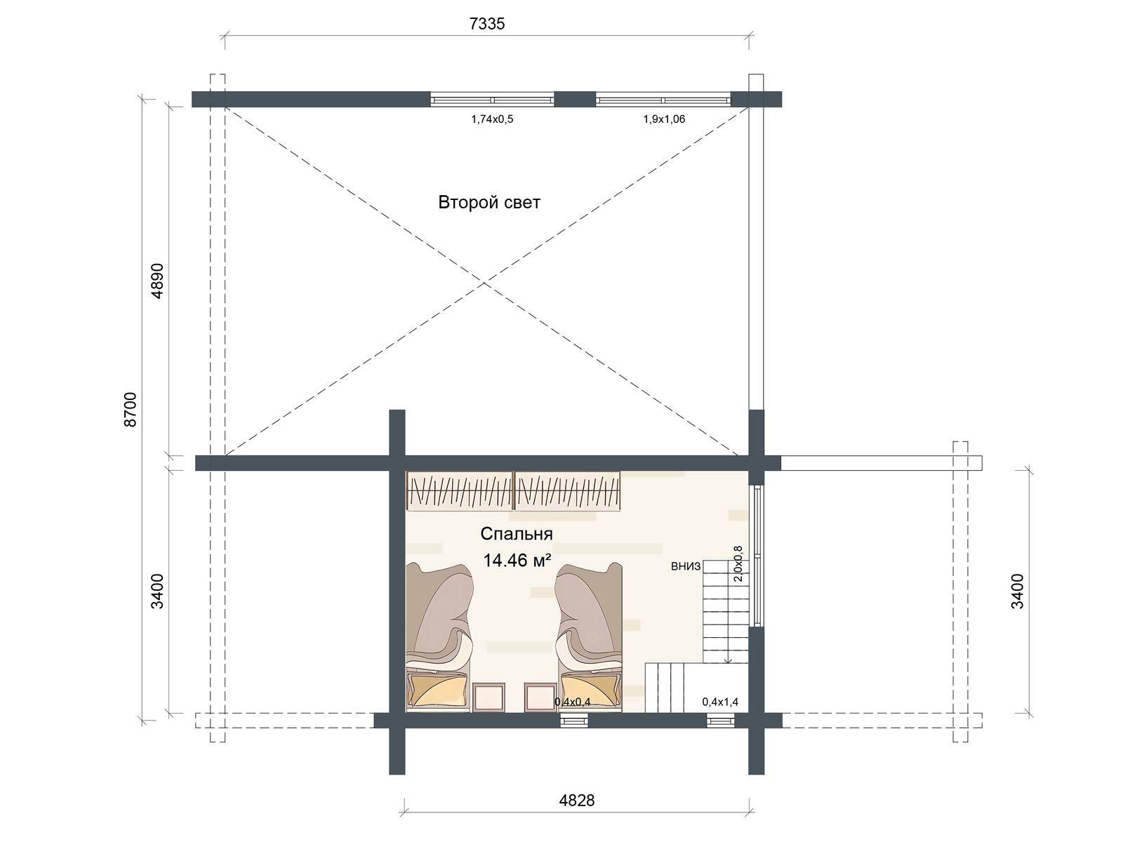 Стропила выполняются из бруска 40х150 мм и устанавливаются с шагом не более 60 см. Для перекрытия над вторым этажом используются лаги 40х150 мм и устанавливаются с шагом не более 60 см. Высота конька стропильной системы от пола второго этажа не ниже 3,6 м.