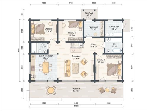 Поэтажные планы, фасады, разрезы, 3D виды. План фундамента. План развертки скатов кровли. План раскладки балок цокольного перекрытия. План раскладки балок межэтажного перекрытия. План стропил. Развертки стен.