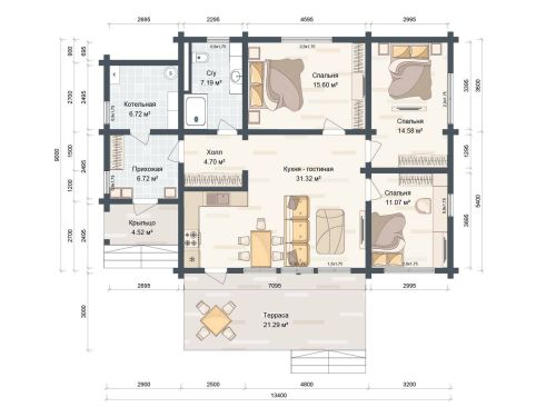 Нижний венец исполняется из бруса 150х150 мм, устанавливается по периметру, и одна перемычка посередине (при необходимости, в зависимости от размера и конфигурации дома, могут устанавливаться дополнительные перемычки). -